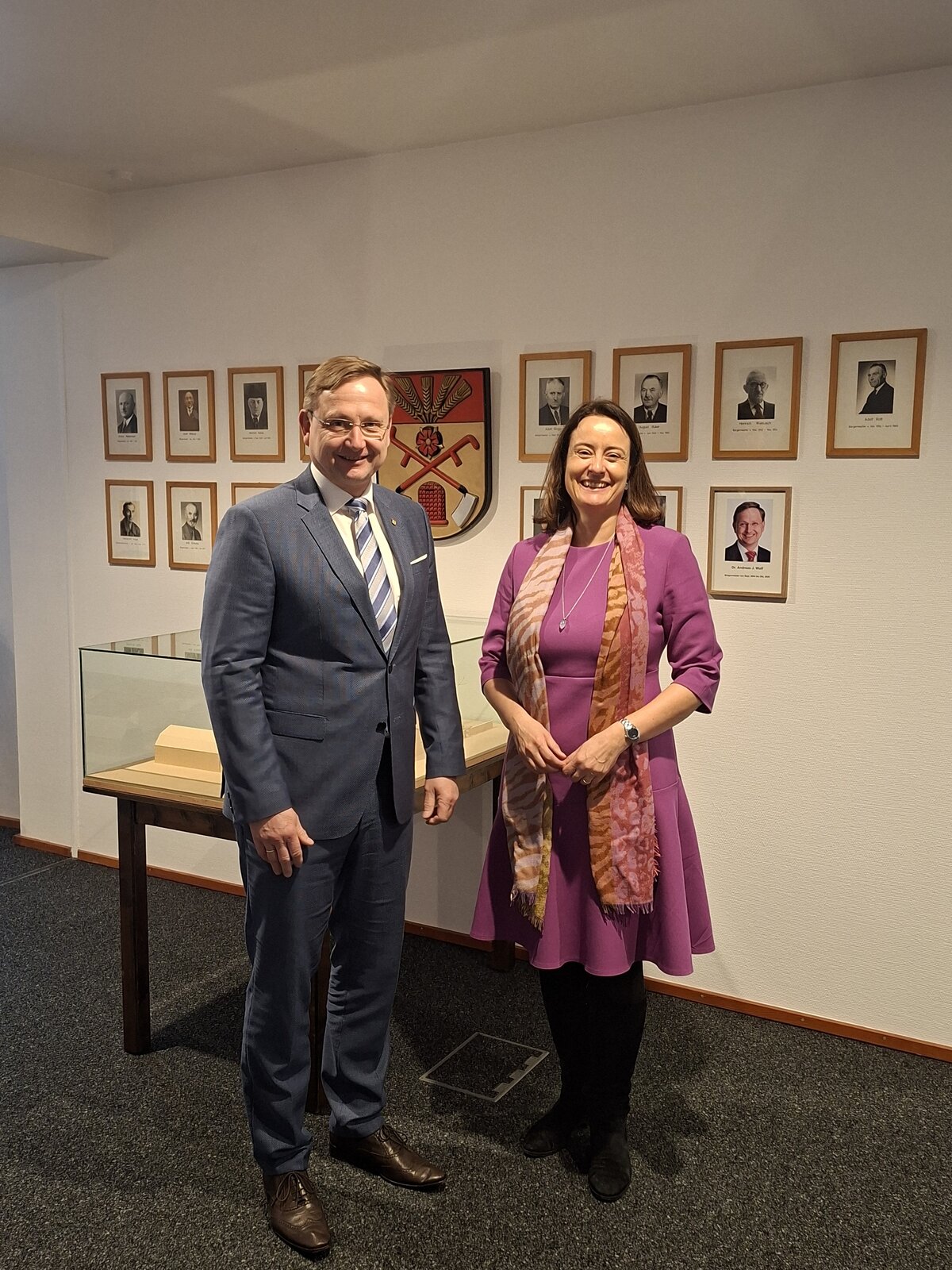 Bürgermeister Dr. Andreas J. Wulf, Regierungspräsidentin Anna Katharina Bölling, vor den Portraits der Augustdorfer Bürgermeister und einem Modell des ehemaligen Gestüts und Jagdschlosses Lopshorn