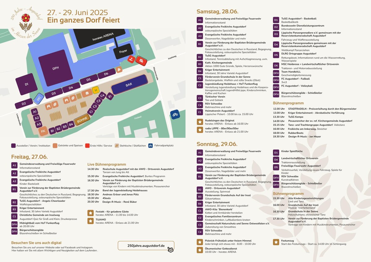 Vom 27. bis 29. Juni 2025 feierte unsere Gemeinde ihr 250-jähriges Bestehen. Drei Tage lang stand Augustdorf ganz im Zeichen von Musik, Begegnung und Geschichte – ein Fest, das uns noch lange in Erinnerung bleiben wird!